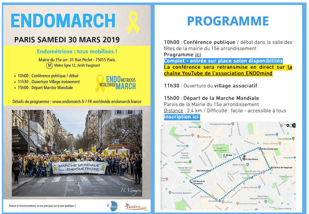 Ce samedi 30 mars se tiendra à Paris la 6e marche mondiale pour l’endométriose. À l’initiative des associations ENDOmind France et Mon Endo Ma Souffrance, ce rassemblement aura lieu dans le 15e arrondissement de Paris à 15 heures (pour vous inscrire : https://goo.gl/fEJZ9h).